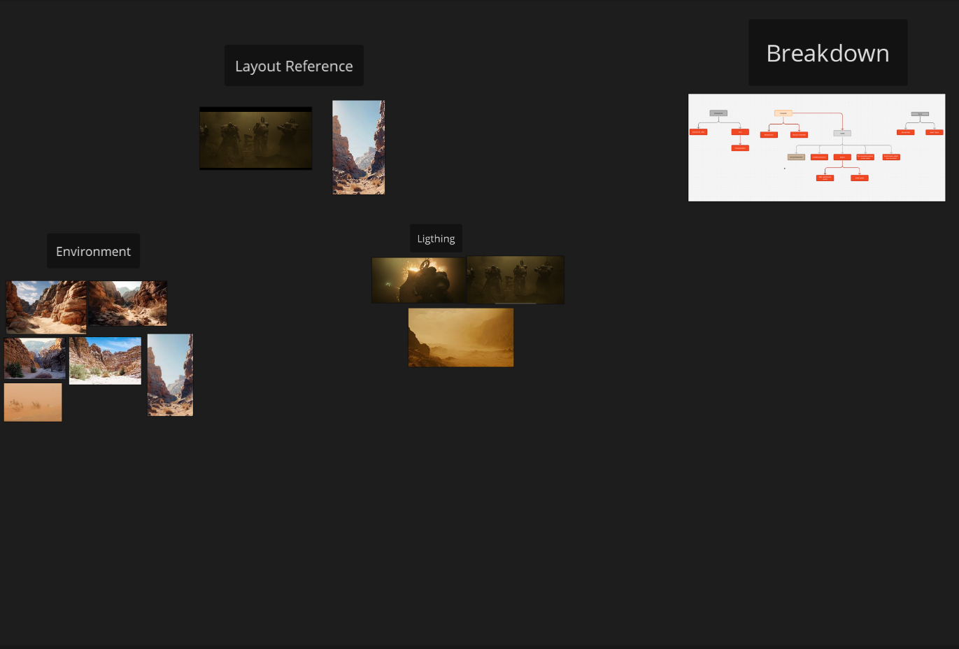 I've also used PureRef to compile other references to get more information about the landscape lighting. So in this process, I was thinking about how my landscape and lighting should look. My purpose was to make it feel like a bleak and dusty atmosphere. Before this process, I actually made a breakdown of the scene.