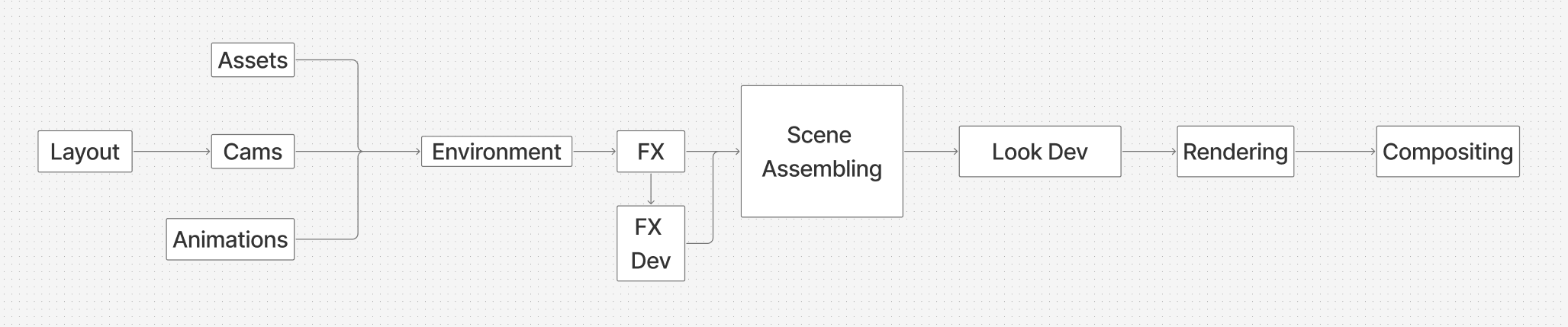 Since these types of FX-heavy scenes are very expensive to handle, assembling and rendering everything in other DCCs like Maya or Blender was not really possible on my machine. This is where the USD workflow became extremely useful.